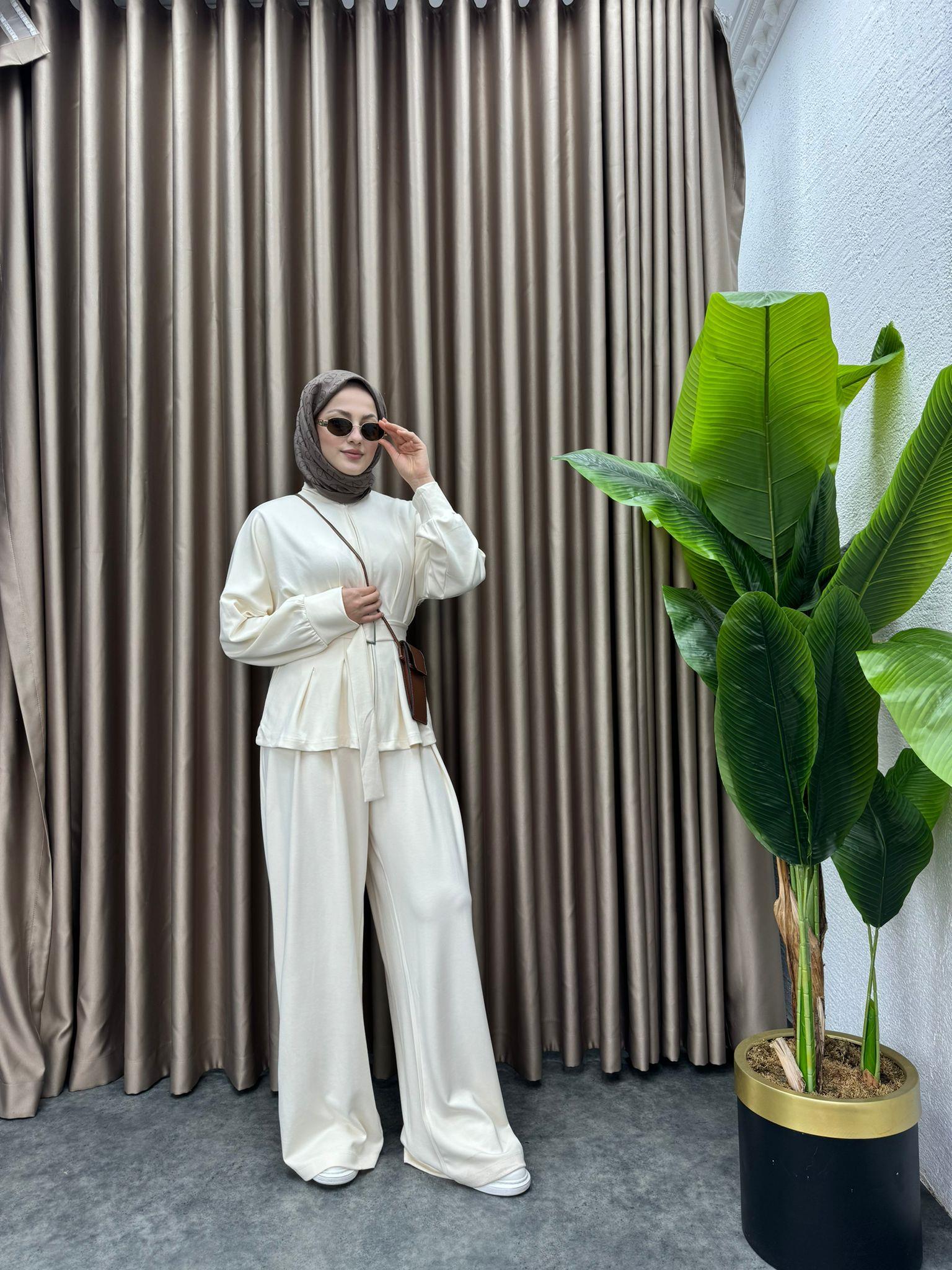 MEYSADESIGN PANTOLON TAKIM Beli Pens Detaylı Kemerli Oysh Takım Bej