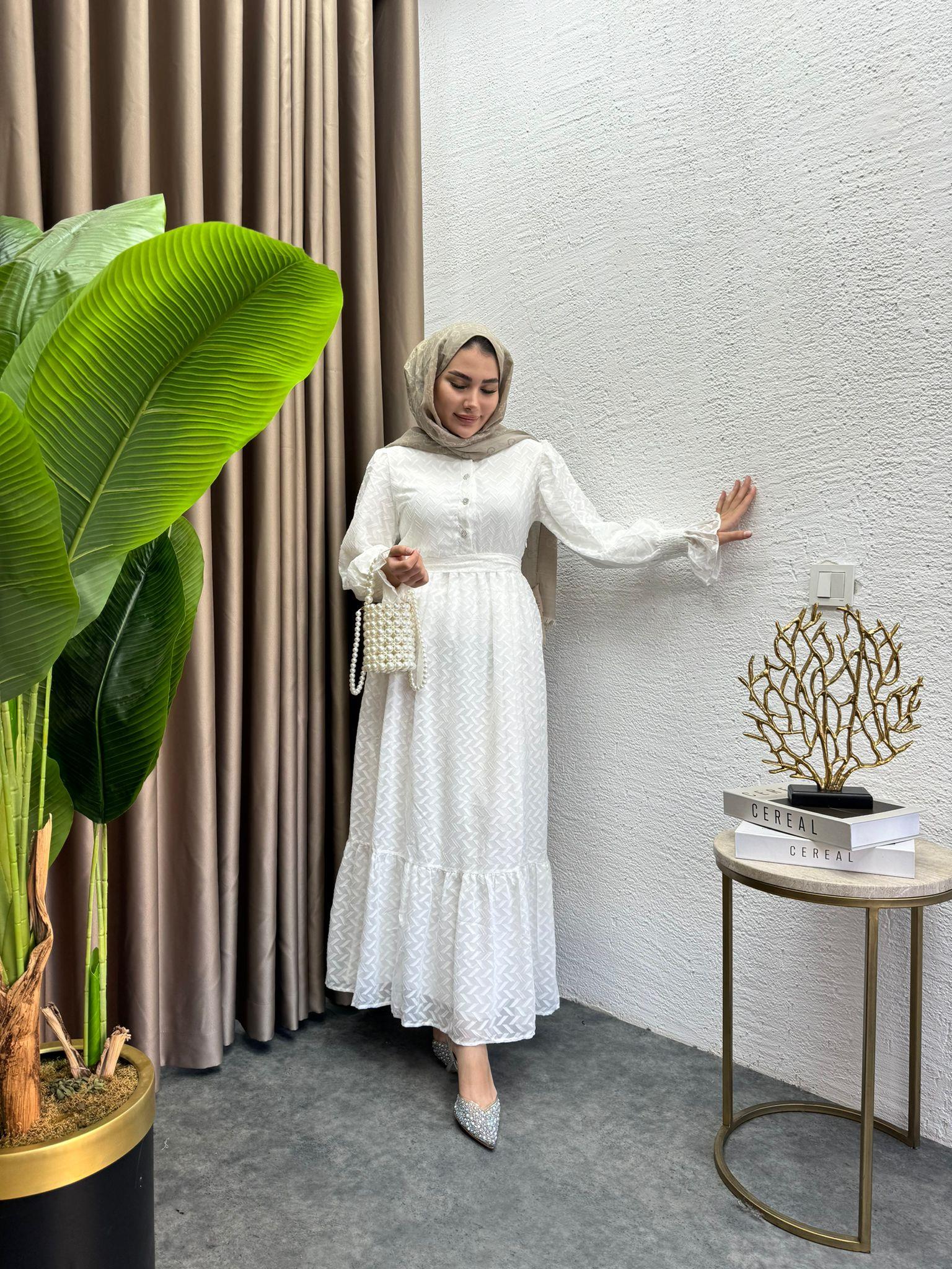 MEYSADESIGN ELBİSELER Bera Desenli Şifon Elbise Beyaz