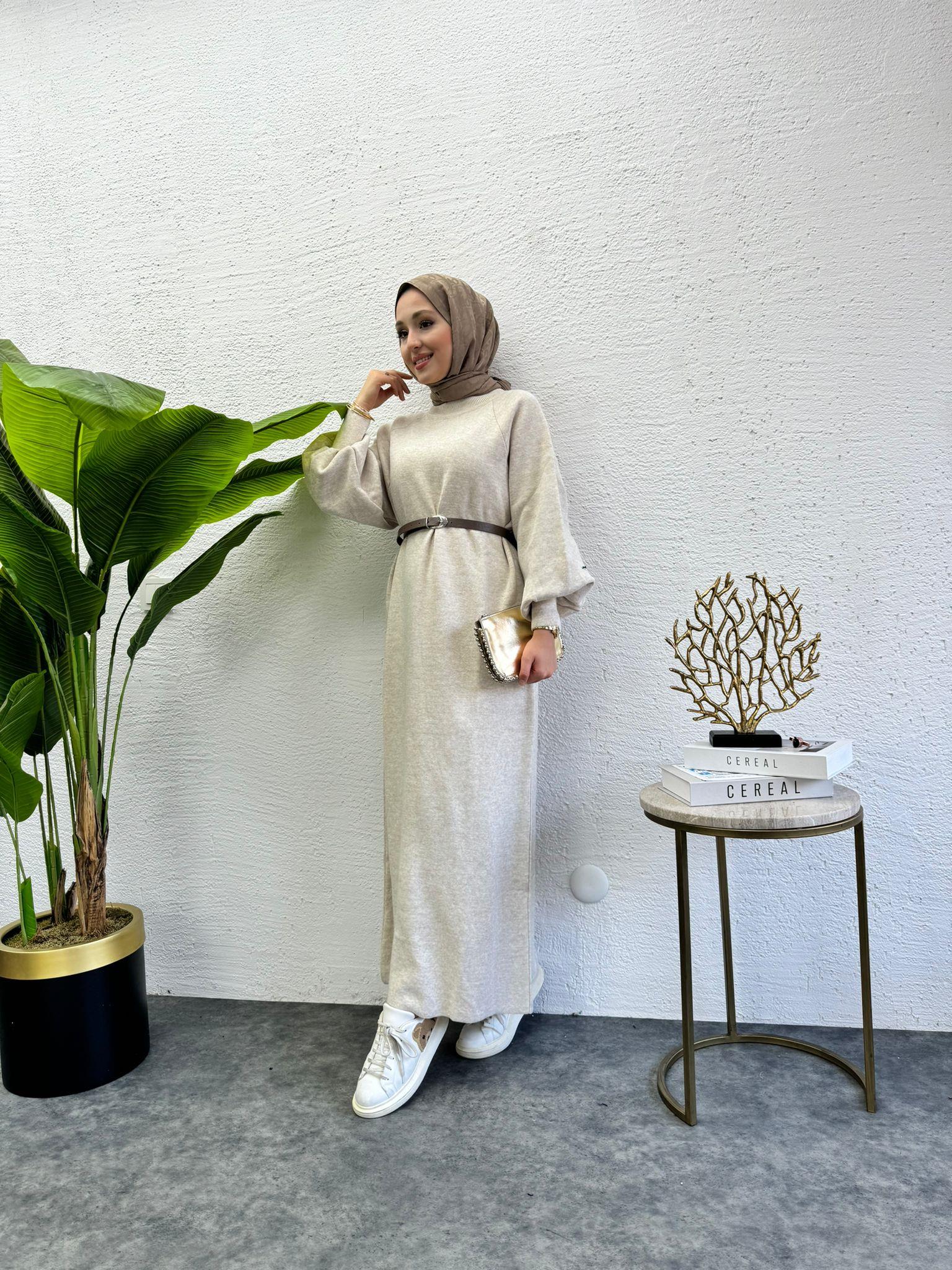 Balloon Sleeve Knit Knit Dress Beige