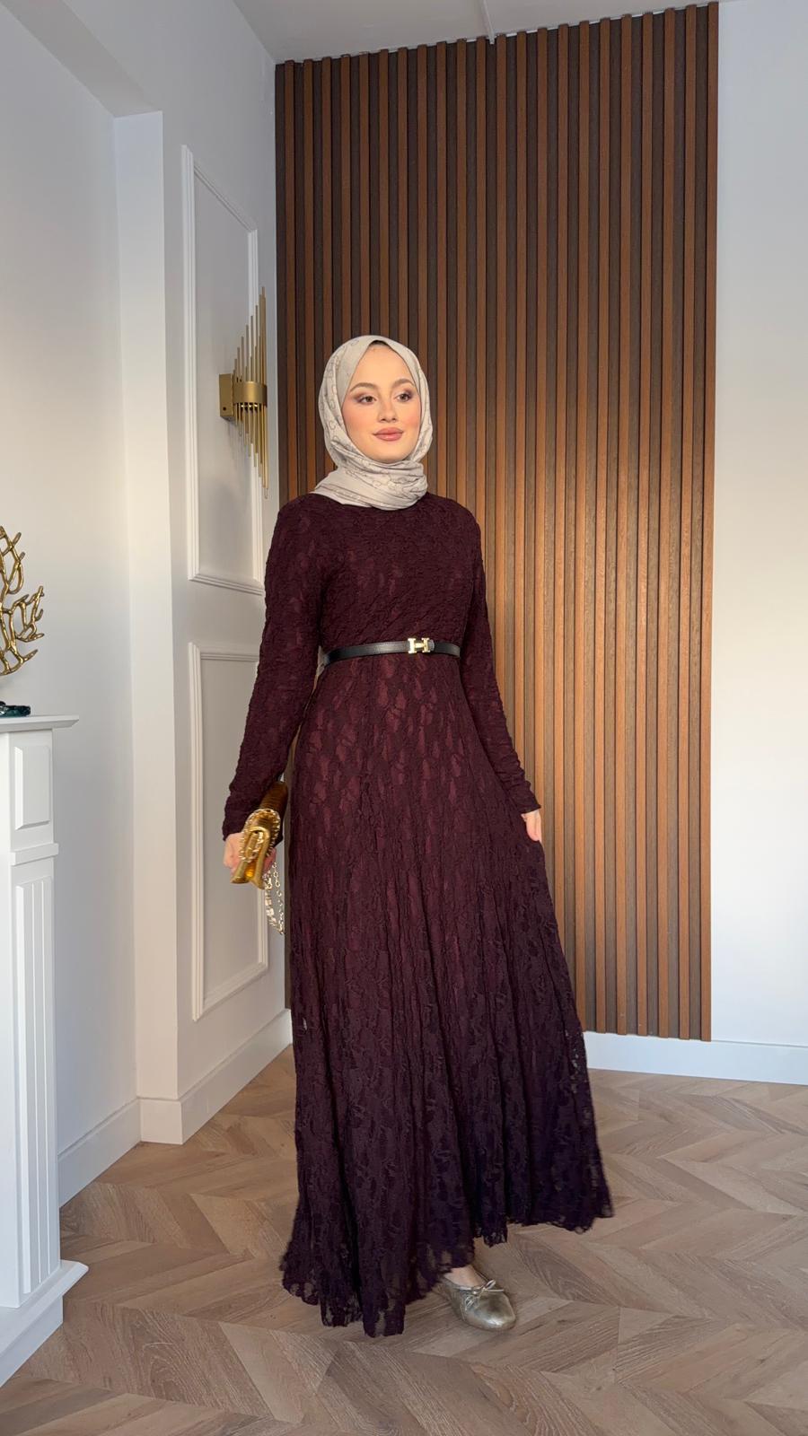Paris Belted Dantel Dress Burgundy