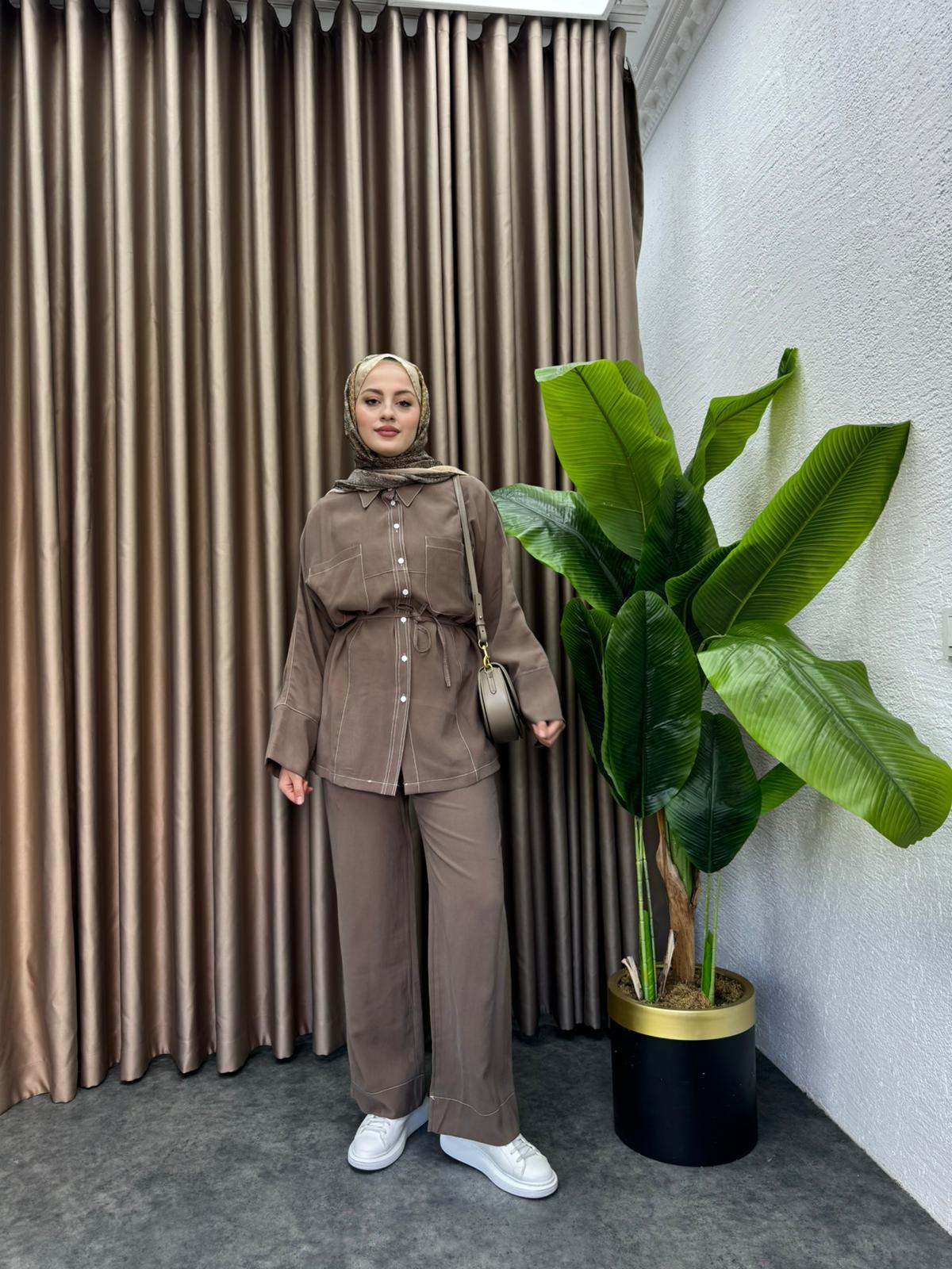MEYSADESIGN PANTOLON TAKIM Lora Çizgili Tensel İkili Takım Acı Kahve