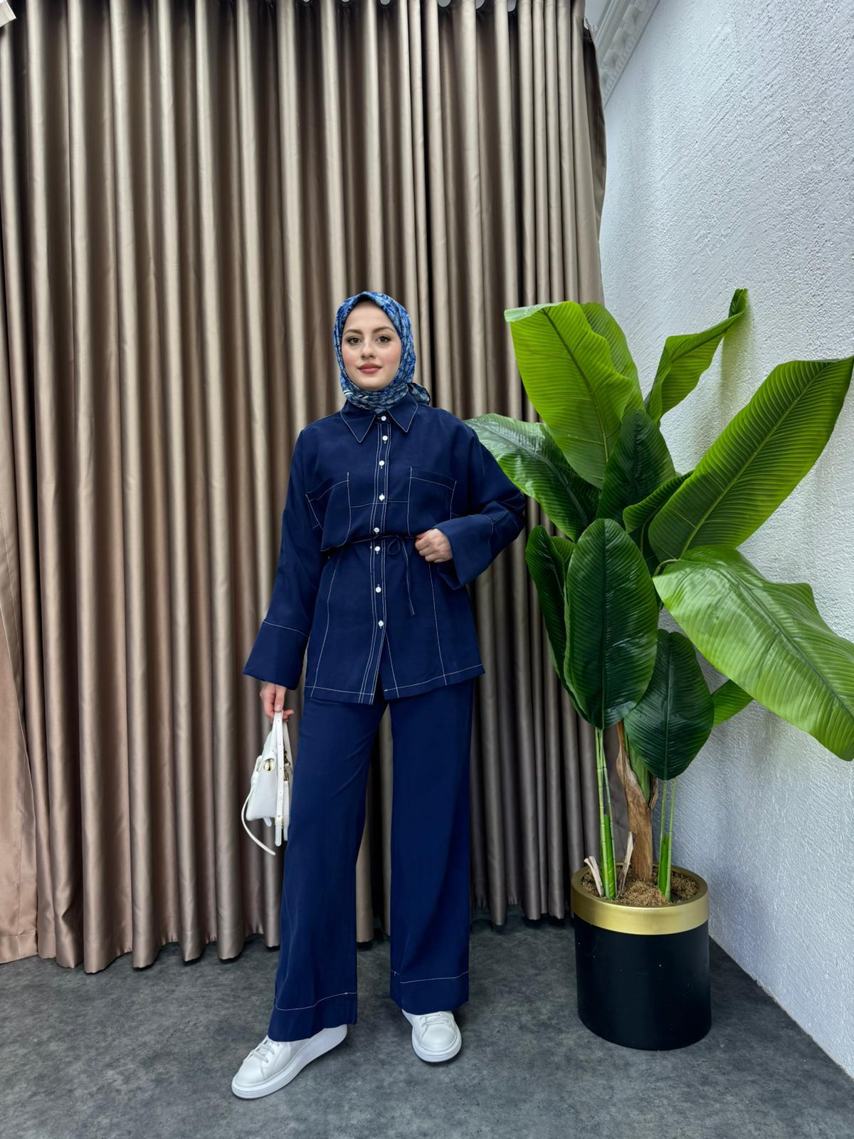 MEYSADESIGN PANTOLON TAKIM Lora Çizgili Tensel İkili Takım Lacivert