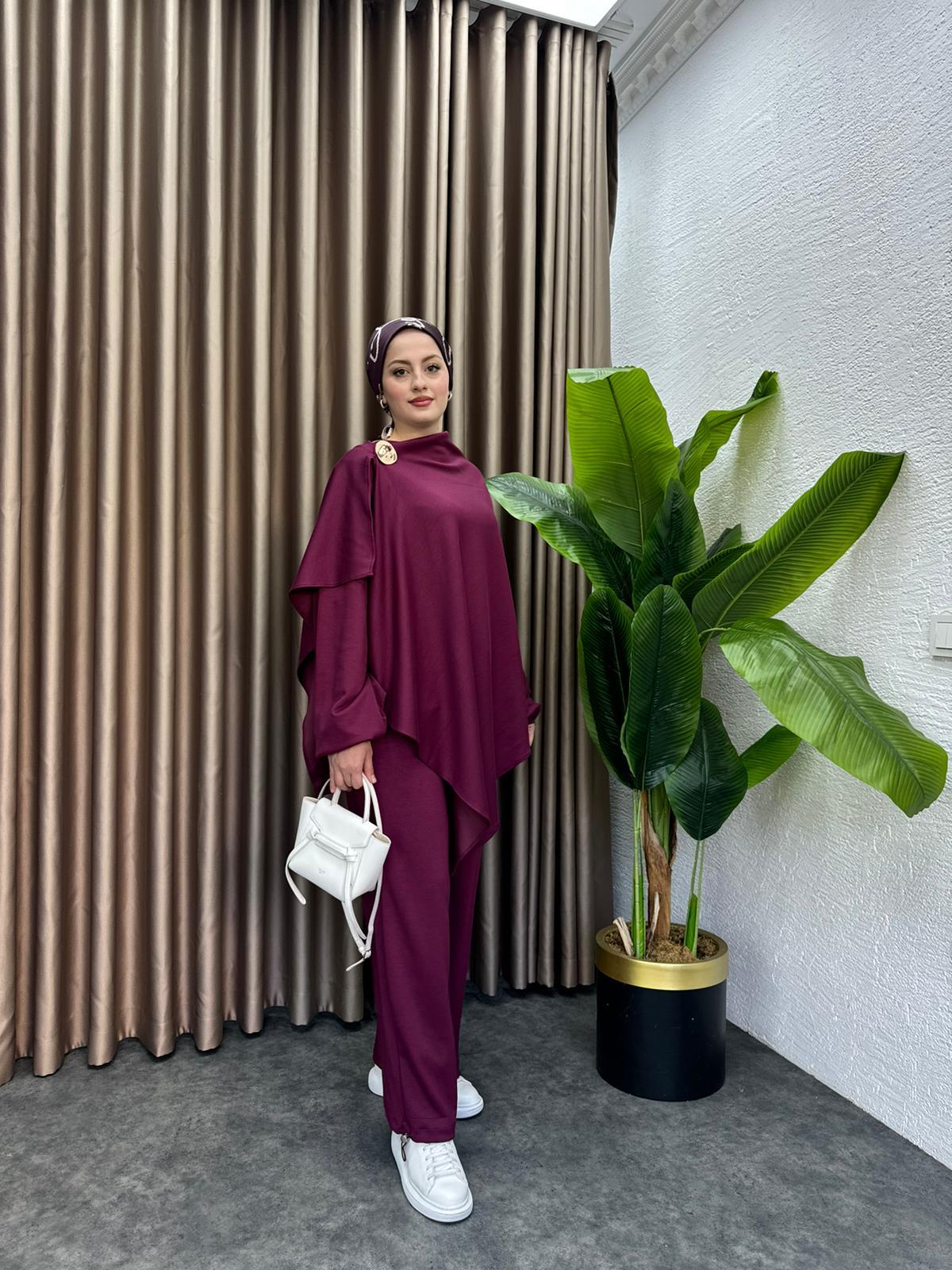 MEYSADESIGN PANTOLON TAKIM Pelerinli Üçlü Oysh Takım Bordo