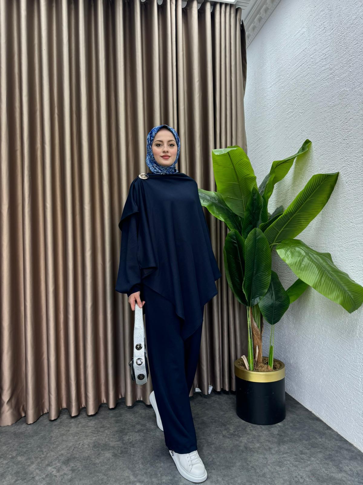 1-2 Beden Oysho kumaştır Üç parçadan oluşuyor üst pelerin detayı dügmelidir çıkartılabilir İç bluz uzunluk 55 cm alt 100 cm Pantolon bilek kısmı lastiklidir düz veya lastikli kullanılabilir