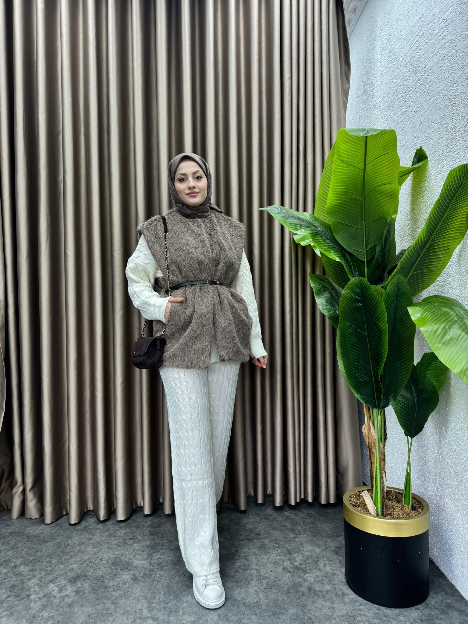 MEYSADESIGN YELEK Peluş Kemerli Yelek Kahve